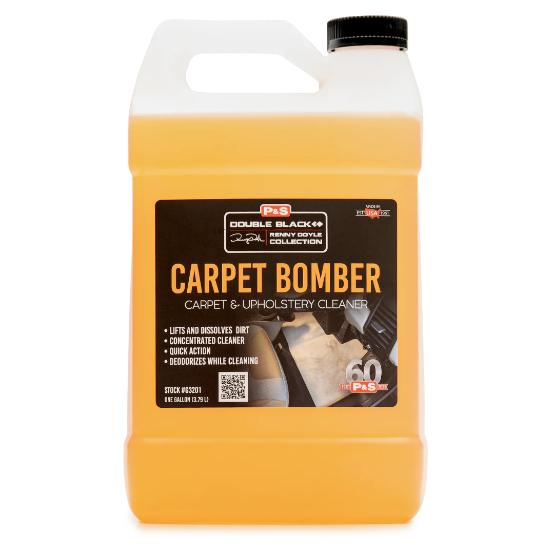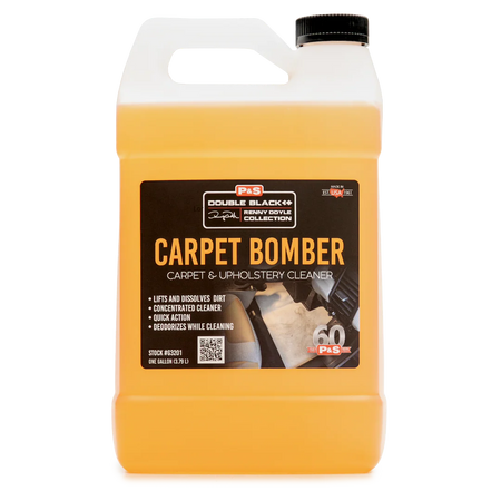 Citrus derivatives, biodegradable cleaners and water based solvents dissolve grease and lift dirt from carpet, vinyl, engines, wheel wells and painted surfaces. Carpet Bomber rinses away foreign particles and stains that most cleaners leave behind. Provides a safe, natural solution to vehicle heavy duty cleaning and degreasing. Carpet Bomber may be used full strength on tough applications, or easily diluted with water for lighter cleaning applications. (Pts.- 12 per case, Gals.- 4 per case)